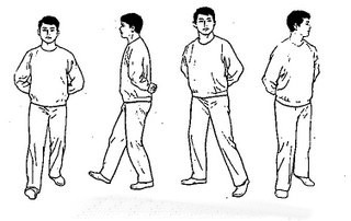 1.要領:除雙手外勞宮穴放在腎俞穴外,其餘要領、口令均與定步行走法相同。
