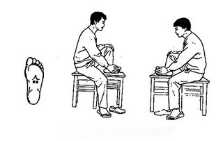 4.如做右腳時,用左手心'勞宮穴'對準'湧泉穴',由小趾向拇趾方向呈劃圈式按摩,要求有接觸感,不要有壓迫感,做72圈,再做反方向72圈,按摩後做三按三呼吸(即:呼按吸起,且口呼鼻吸)。