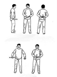 (3)兩手對稱:棍手升,空手降;棍手降,空手 升,升降速度要協調。兩側劃環後,再用棍端點'勞宮'做法是:空手放在'中丹田'前不動,指尖向前,另手握棍,用棍端輕點空手的'內勞宮穴'。一點,停一停,鬆開;二 點,停一停,鬆開;三點,停一停,鬆開;四點,停一停,鬆開。再把棍子換到一隻手,同樣點四次後,做簡式收功。