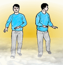 2.順序 :(1) 預備功法:松靜站立(默念60個數); 三個氣呼吸(先呼後吸); 三開合。(2)四個方向8個升降開合。 (3)慢步行走法採用自然呼吸,行走40~60分鐘(每分鐘走2~3步左右)。以先出左腳為例:松左腳,左腳尖點地(右手'中丹田'左手胯旁),左腳邁出一小步,腳跟先著地,慢慢放平,重心慢移向前腳,同時慢慢轉腰轉頭,兩手導引還丹,稍停片刻,頭、身體轉回正面,再把右腳邁出去,做法上。