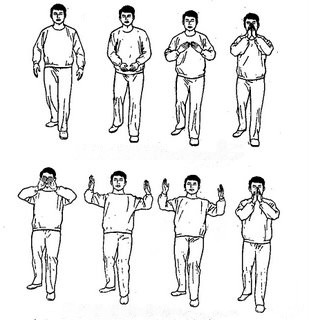 3.功法順序: 預備法;一前後;二下蹲;三左右;四上舉;五劃環;六點'勞宮'穴;收功。