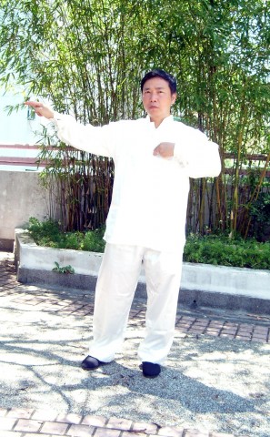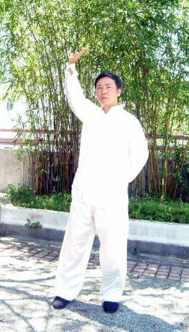 腳蹺手摸,轉腰轉頭,吸吸呼,腳要走正, 百脈貫通. 閒庭信步氣自生。