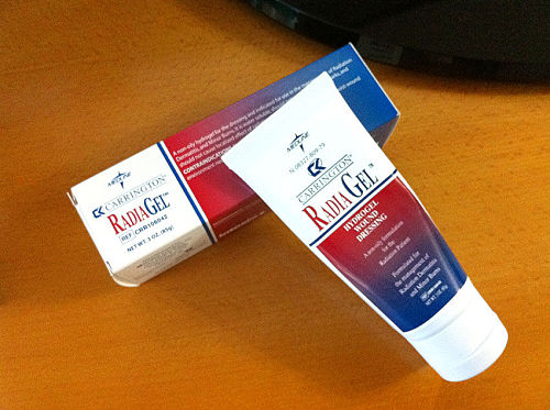 「畫位」後個多星期開始,請就為電療時的皮膚護理做好準備。一般放射治療師是不會建議病人在電療前或期間塗抹任何東西的,但如果不做好準備及相關的護理的話,日後電療時的皮膚會被灼傷得更嚴重。那到底要塗甚麼東西呢?其實坊間是有專為電療皮膚護理使用的啫喱的。大部份人都會選用「Radiagel(電膚寶)的,這護膚啫喱在一般的復康店有售,並可於電療前兩星期開始使用,每天塗兩至三次在電療的位置上。記得於「畫位時」,問清楚設計師是否會電頸項及腋下的位置,因為射線能觸及的地方,都要塗上啫喱的。
