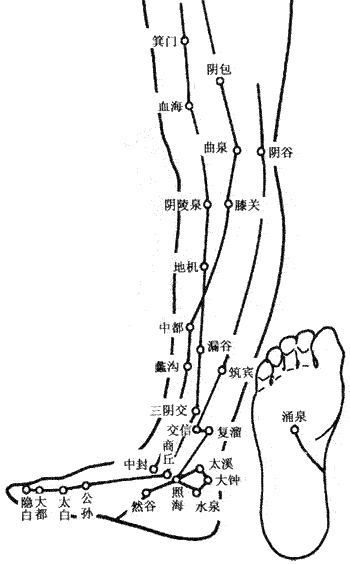 經屬:足太陽脾經,系足太陰、厥陰、少陰之會。擊中後,下肢麻木,失靈,傷丹田氣。