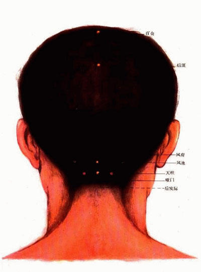 位置:在頂部後正中綫上,第一與第二頸椎棘突之間的凹陷處,(後發際凹陷處)